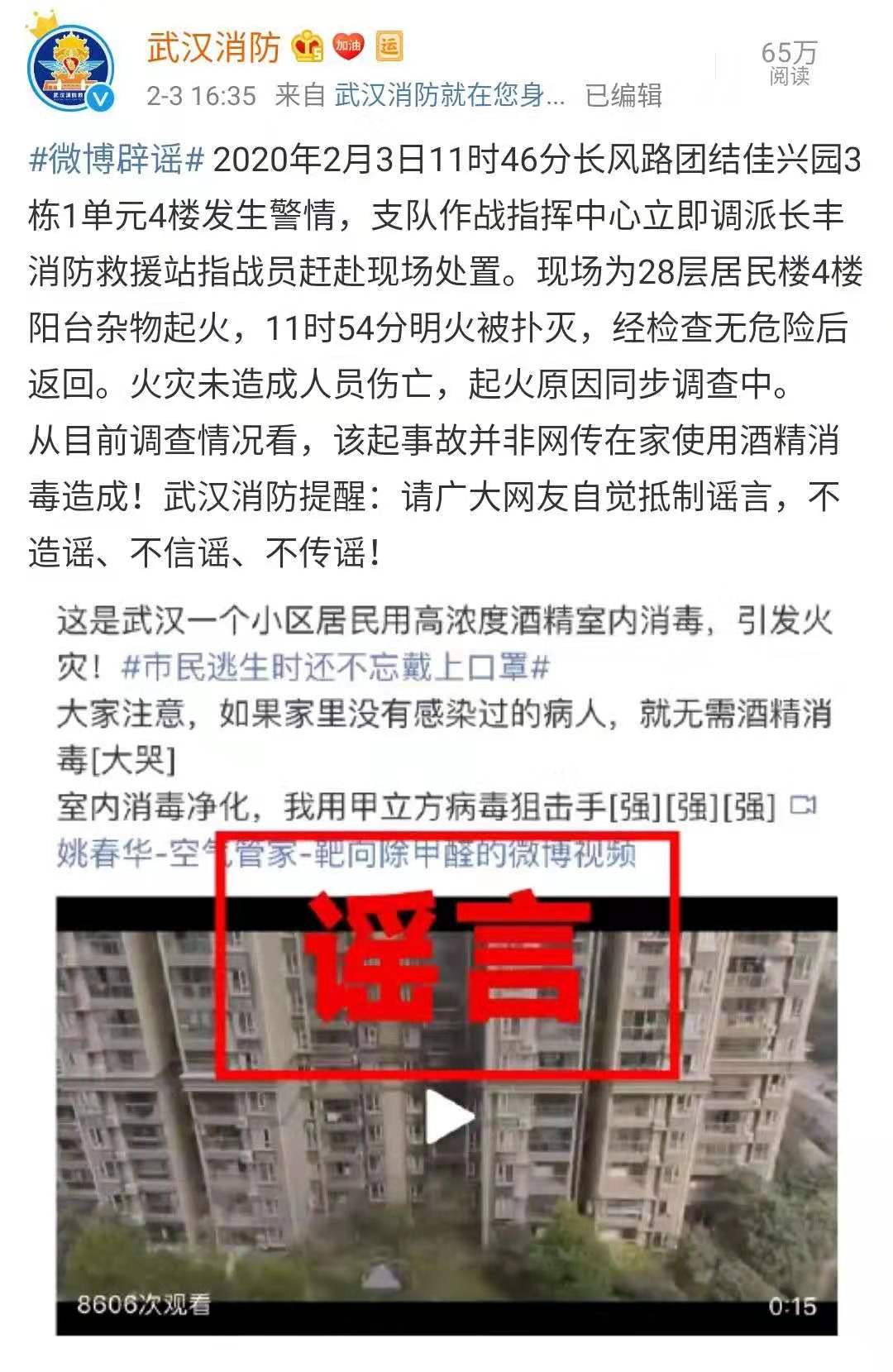 網上有傳言:天津南開區汾水道一車主因噴75%酒精濃度的消毒水,抽煙時不小心自燃,引發命案。無獨有偶,2月3日上午,武漢市硚口長風路一居民樓起火,有傳言稱起火原因是居民用高濃度酒精室內消毒。