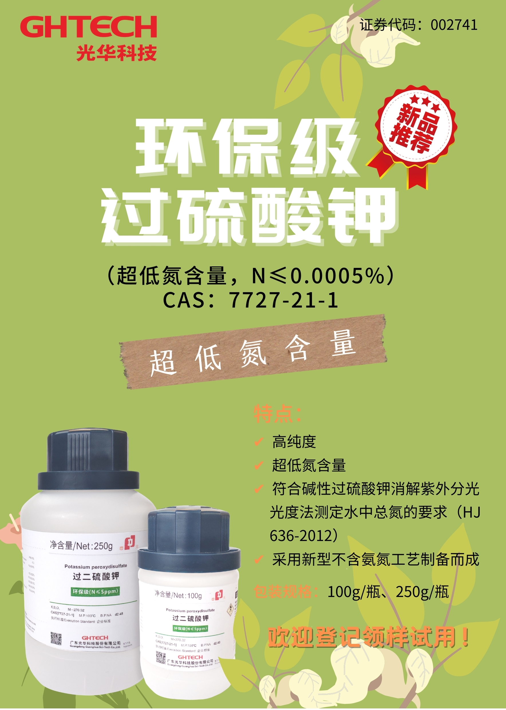 光華科技現場展示的多元化學產品,引起觀眾與業內人士的濃厚興趣,尤其是現場推出的新品——環保級過硫酸鉀,成為全場焦點。